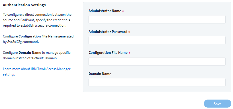 This section contains the information that the source uses to authenticate with the Tivoli Access Manager system. After you click Connection Settings the following user interface page is displayed.