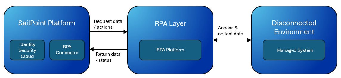 Finally, the data or status flows back: Disconnected application > RPA Platform > RPA Connector > SailPoint.