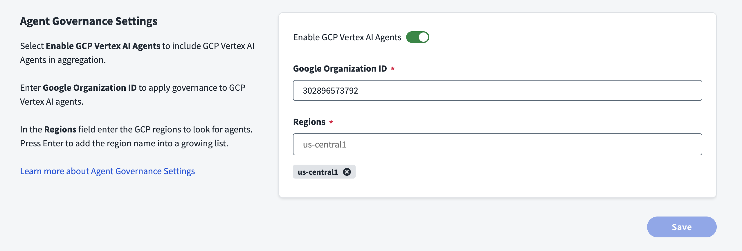 Select Enable GCP Vertex Agents to include AI agents in aggregation.