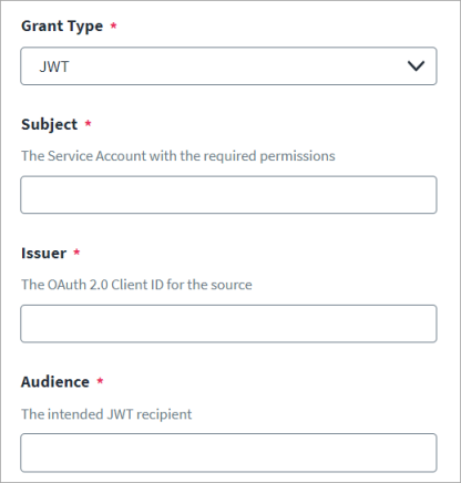 The following information is required if the JSON Web Token (JWT) Grant type is selected.