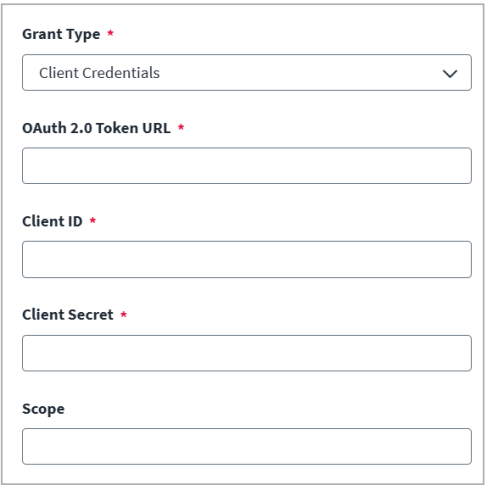 Configure OAuth 2.0 authentication to secure your connection to the source. The connector supports both Client Credentials and Refresh Token grant types.