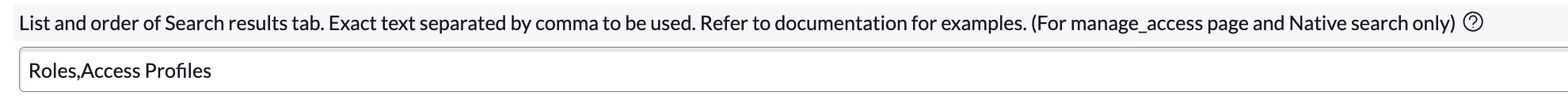 Go to settings with the label. List and order of Search results tab. Exact text separated by comma to be used. Refer to documentation for examples (x_sap_intidn.x_sp_spnt_snow_int.specify_tab_order). By default, the value of the property is set to be "Roles, Access Profiles". You can hide or show the respective tabs if you add/remove those values. For example,