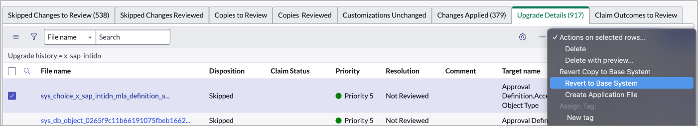 Open the skipped records to review them. Select single or multiple records and then Revert to Base System to restore them to their original, out-of-the-box (OOB) state.