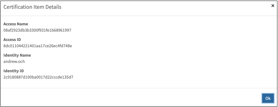 This widget displays a list of identities with pending or completed decisions. Select Show Campaign Details to view additional information about the respective campaign. Use the search option to filter identities within the list. Select Exit Certification to exit the current process and return to the landing page.