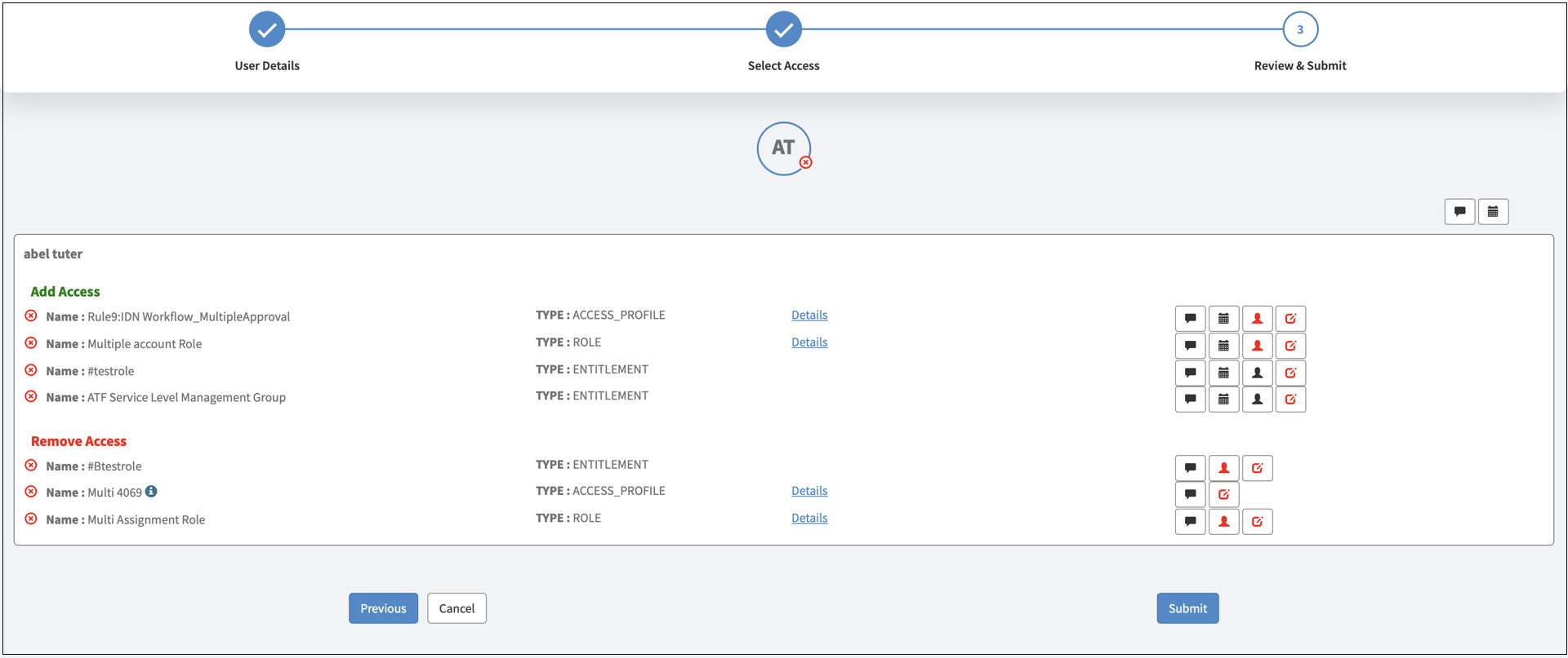 This widget displays the line items of selected users and selected objects for adding or removing access. Select Validate/Submit to see related warnings and errors.