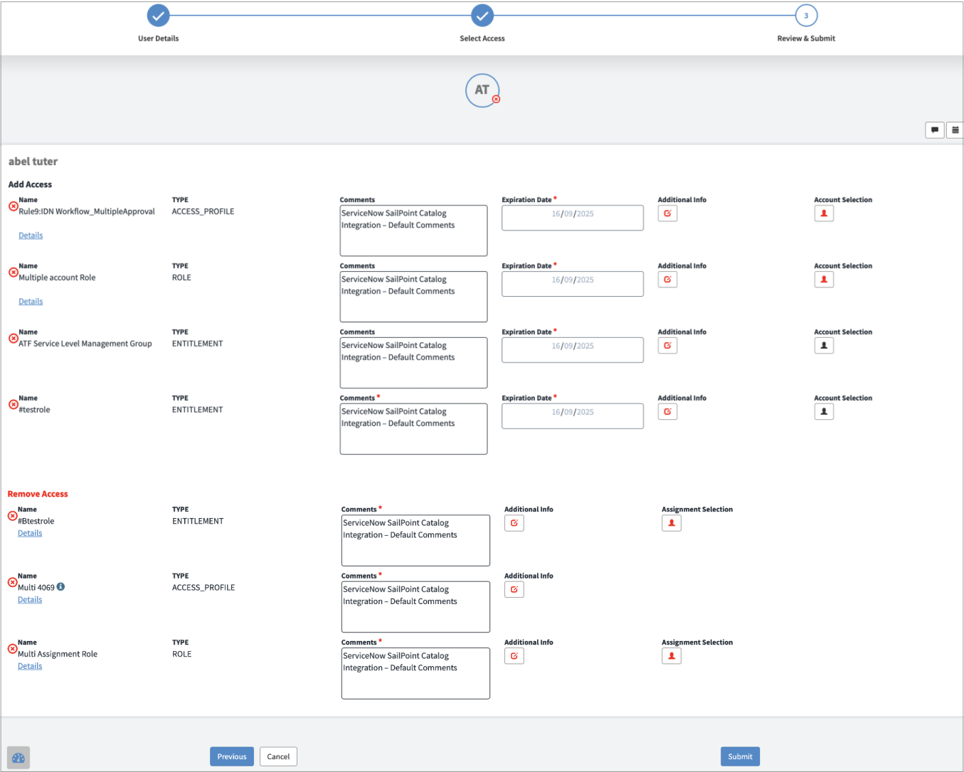 The Comment, Account Selection, and Assignment Selection fields are populated based on the settings in ISC. The Expiration Date and Additional Information are based on the configuration in ServiceNow.