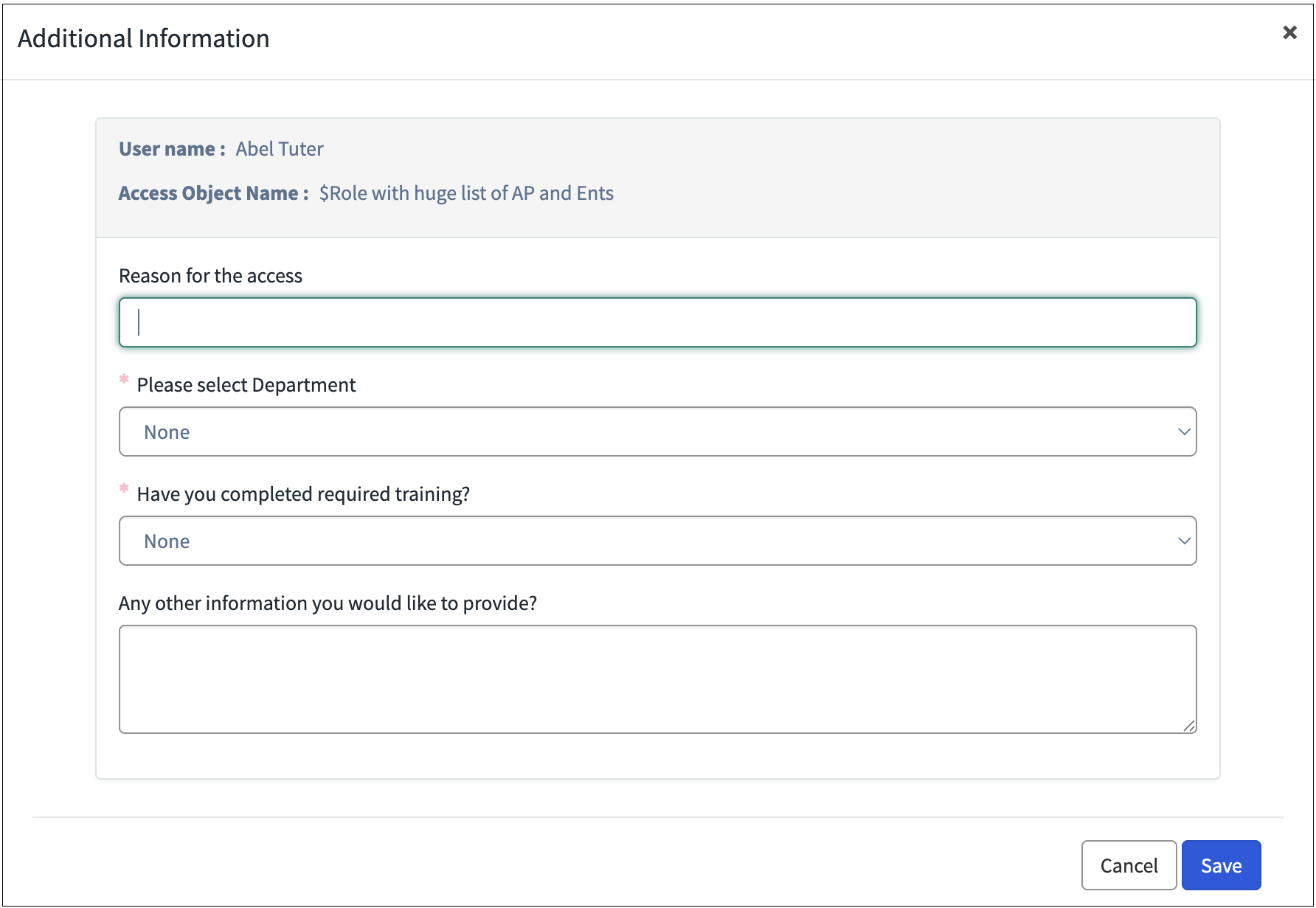 When selected, this allows end users to provide additional information required for the chosen access object.