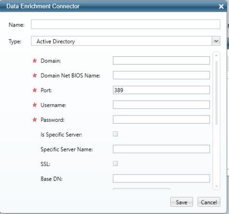 The configuration fields in the data enrichment connector configuration tab (above) depend upon the selection of the Active Directory as the DEC type.