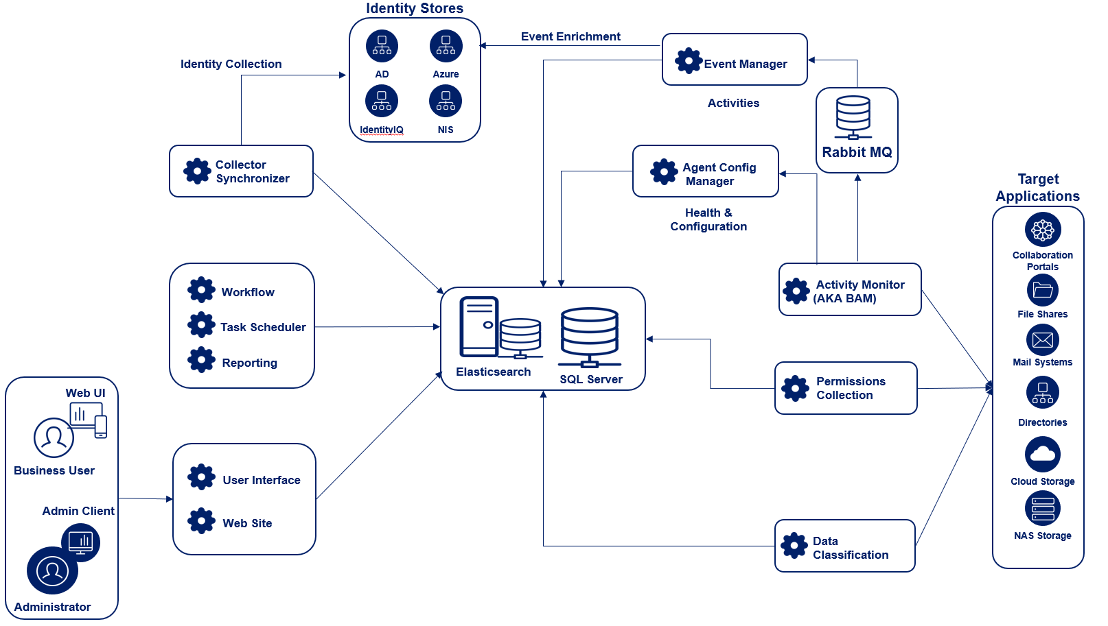 The collectors focus on completing the work assigned to them by the File Access Manager Central Permissions Collector and Central Data Classification services. These collectors pass processed information - through the File Access Manager Message Broker (RabbitMQ), which provides secure communication - back to File Access Manager Services. The information is then persisted to the database.