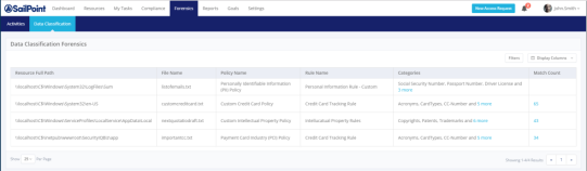 The Data Classification Forensics screen can be found by navigating to Forensics > Data Classification. It displays data classification results, based on your active policies. Use filters to focus on specific data. You can sort the results by Match Count. The returned records are limited to 10,000 results.