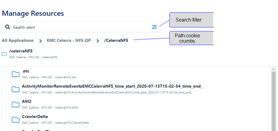 To navigate through the resources, select a child resource to change the level displayed, and display the child resource content, or select a path on the cookie crumb list on top of the screen, to move up to the level selected.