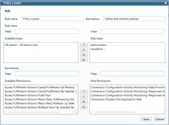 Fill in the relevant fields, moving permissions between the Available Permissions list and Role Permissions list as desired using the move buttons >, <, >>, and <<.