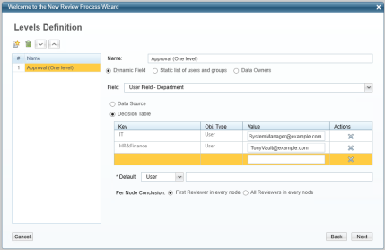 Field Description Key What to look for in the field above. Object Type The User or Group of reviewers. Value The user or group to which to send the review. Actions Select the X in this column to delete the corresponding row of the Decision Table. Default This is the default reviewer. Select either User or Group from the dropdown menu, then enter the name of the default User or default Group. The default User or Group can be the same as the entity in the Key column of the Decision Table. While the default entity may also be one of the entities listed in Key or Value, the system selects the default entity from the authentication store if no other entity is available.