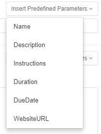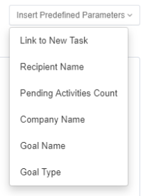 To add variables to the heading or message text, select Insert Predefined Parameters, and select one or more fields in the dropdown list. The values in the lists vary according to the context.