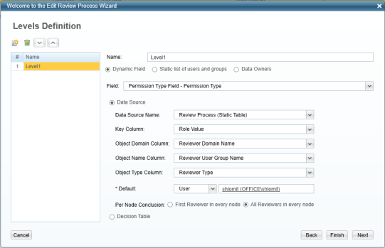 Select one of the following, depending upon the type of field desired for Level 1: Dynamic Field, Static list of users and groups, or Data Owners.