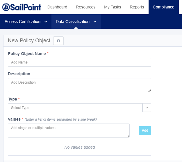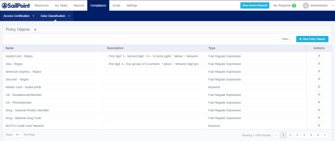 Navigate to Compliance > Data Classification > Policy Objects. to open the Data Classification – Policy Objects page.