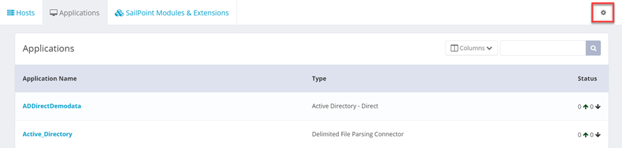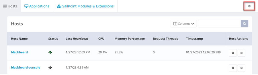 Use the gear icon on the right side of the title bar to define global settings for all hosts in IdentityIQ. These settings are used for all hosts that have not explicitly overridden the defaults.