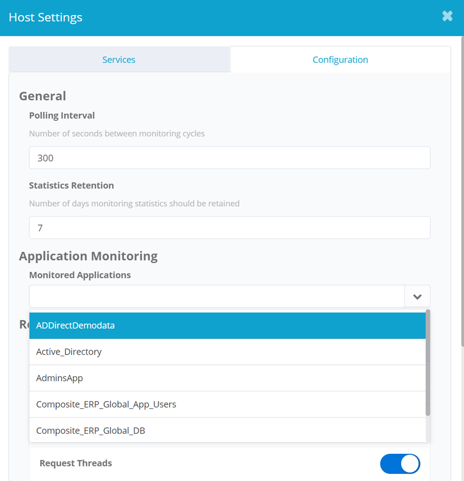 The Configuration tab lets you set up host-specific monitoring configuration. What you set here overrides the global defaults for Polling Interval, Statistics Retention, and to enable and disable given retained statistics, such as CPU or task threads.