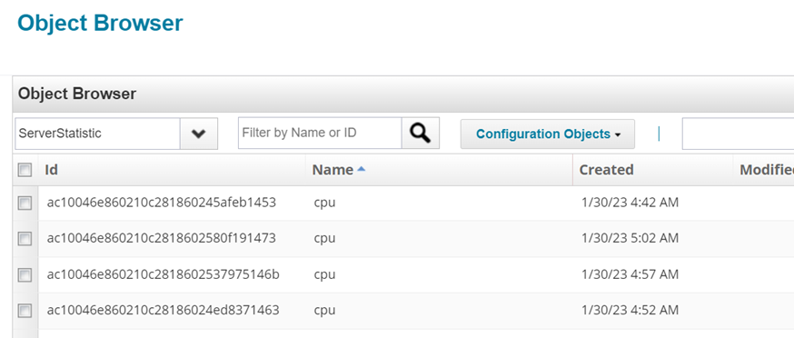 Objects of type ServerStatistic contain the statistics for monitored hosts. The number of ServerStatistic objects you can see in the Debug pages varies depending on how long you have configured Environment Monitoring to retain statistics and how frequently the monitoring service runs.
