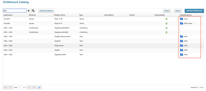 Cloud Access Management classifications will be visible for cloud based entitlements. The classifications correspond to the cloud provider for which the entitlements are associated. The classifications for a cloud access group entitlement will also include the classifications of its cloud access roles.These classifications will display in the Classification column within the Entitlement Catalog (and other tables within IdentityIQ) as shown below.