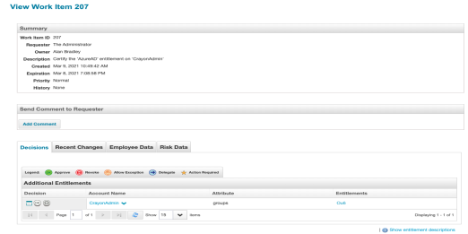 After selecting a work item, click on the entitlement. The same dialog as the Identity Warehouse will display.