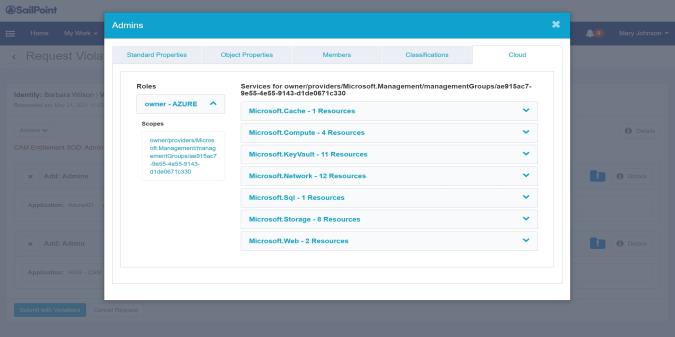 This Cloud tab will display when viewing a request violation work item. If a created policy conflicts between two cloud entitlements, this tab will display.