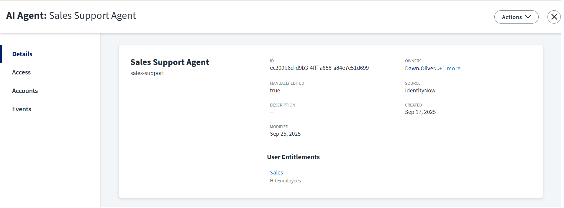After AI agent data has been onboarded into Identity Security Cloud, you can assign owners to AI agents and update their attributes. You can also create an AI agent within your tenant in cases where a source account may represent an agent.