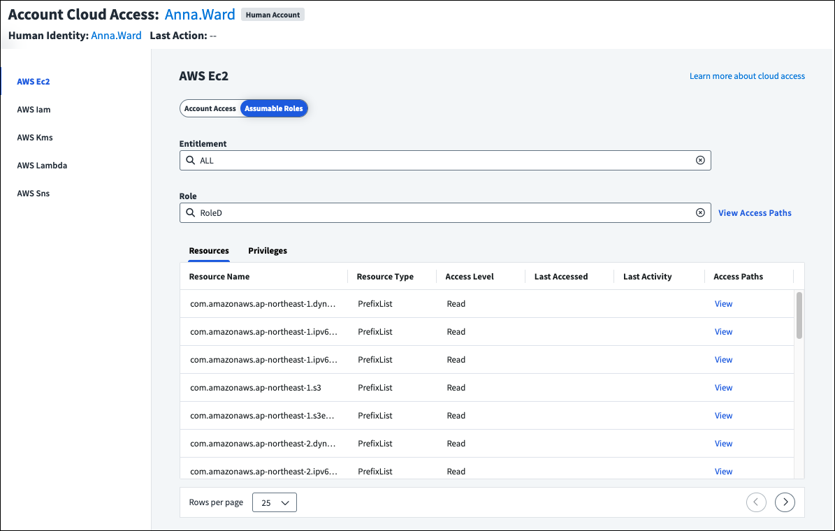 If the entitlement is on an AWS source and grants access to an AWS resource, you can select Assumable Roles. If the identity can assume AWS IAM roles, including roles that can be indirectly reached through role chaining, they can be selected from the Role field to display the associated resources and privileges.