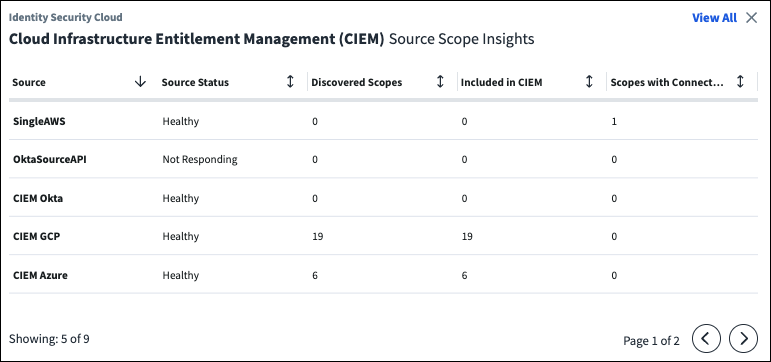 You can view high-level status information about the source scopes you've selected on your MySailPoint page. You can view more detailed information about the authentication and authorization errors that SailPoint CIEM encountered when pulling data from your selected cloud scopes in the Cloud Scope Status Report.