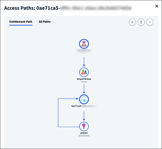 Access paths display between scoped objects like groups, policies, and projects granting the user access to the selected resource. This includes the direct access granted by the entitlement or all access paths to the resource. The access granted by the entitlement is highlighted.