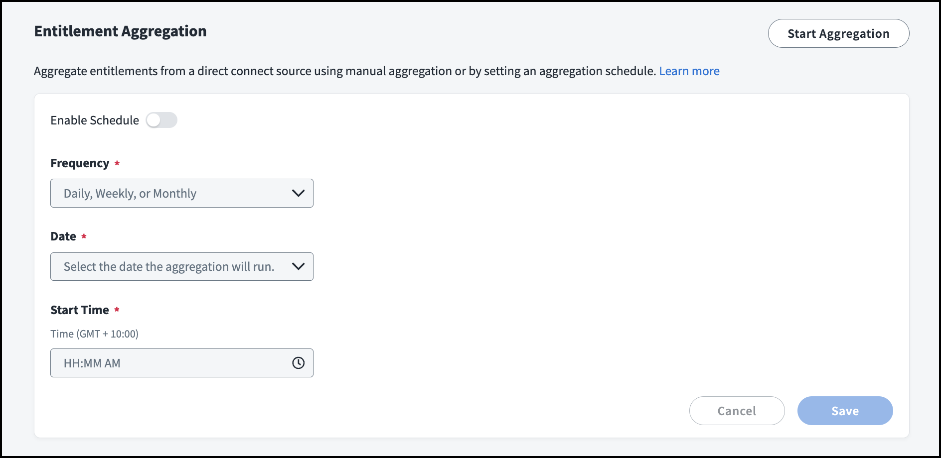 For source types that do not support entitlement type edits through the UI, choose whether to perform a one-time manual aggregation or to schedule recurring aggregations.