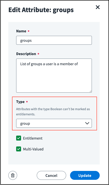 Under Type, choose the type of value this attribute will contain. You can choose string, long, int, or boolean, or you can link entitlement types by choosing another entitlement type.