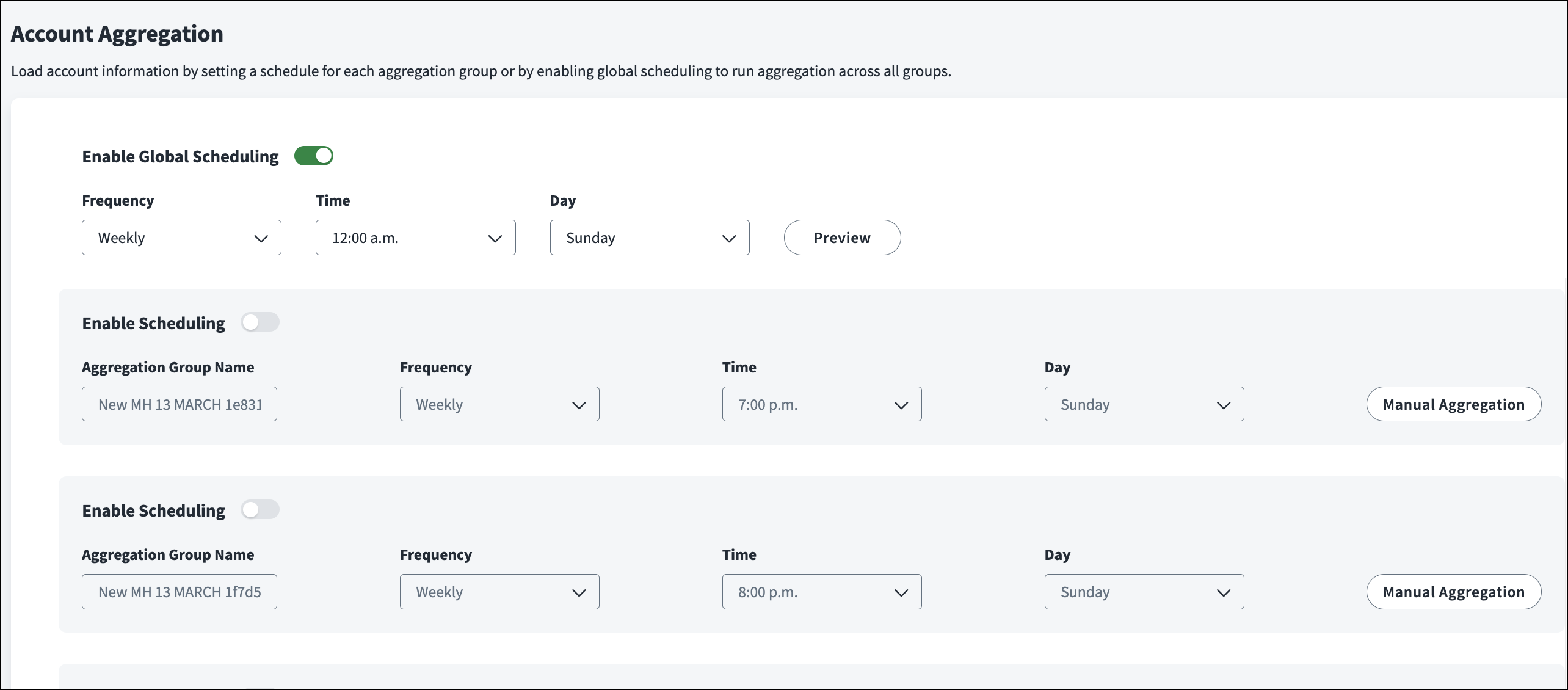 You can schedule aggregation to automatically load new account data for all aggregation groups through global scheduling or set specific schedules for each aggregation group.