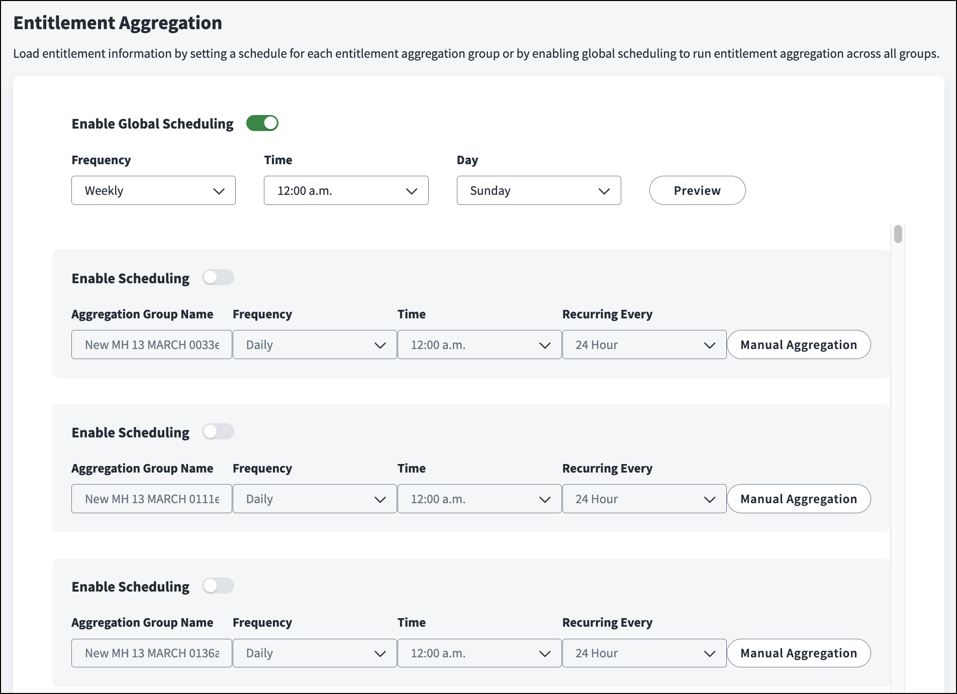 You can schedule aggregation to automatically load new entitlement data for all aggregation groups through global scheduling or set specific schedules for each aggregation group.
